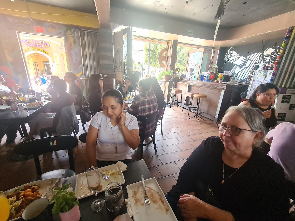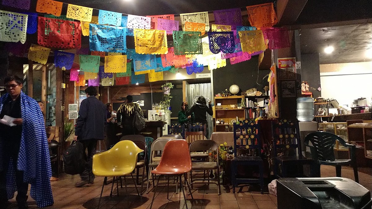 A safe space for everyone: women, nonbinary folks, and men. Located just a few blocks from the border, if you’ve been deported, you can come make a phone call to let your family and friends know you’re okay. Offering (with no expectation of money as a barrier or requirement) internet, use of a computer, phone calls, bathrooms, drinking water, a refuge from the sun and crowds. Projects include Caricia Culinaria with affordable vegetarian and vegan food, Rabia Café, volunteer-run coffee and beverage stand at solidarity prices, Rabia Callejera community bike collective and workshop, Comida No Bombas weekly free food shares, screen printing workshop, fanzine library, film club.